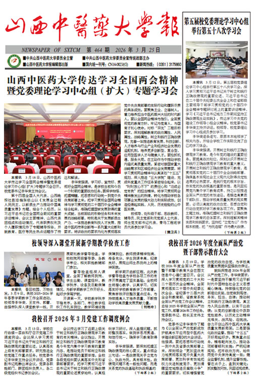 2026-03 山西中医药大学传达学习全国两会精神暨党委理论学...3月18日,山西中医药大学传达学习全国两会精神暨党委理论学习中心组(扩大)专题学习会召开。校党委书记李华荣主持会议。第十四届全国人大代表、山西晚报社副总编张临山以《发展全过程人民民主、以新质生产力推动中国高质量发展》为题...