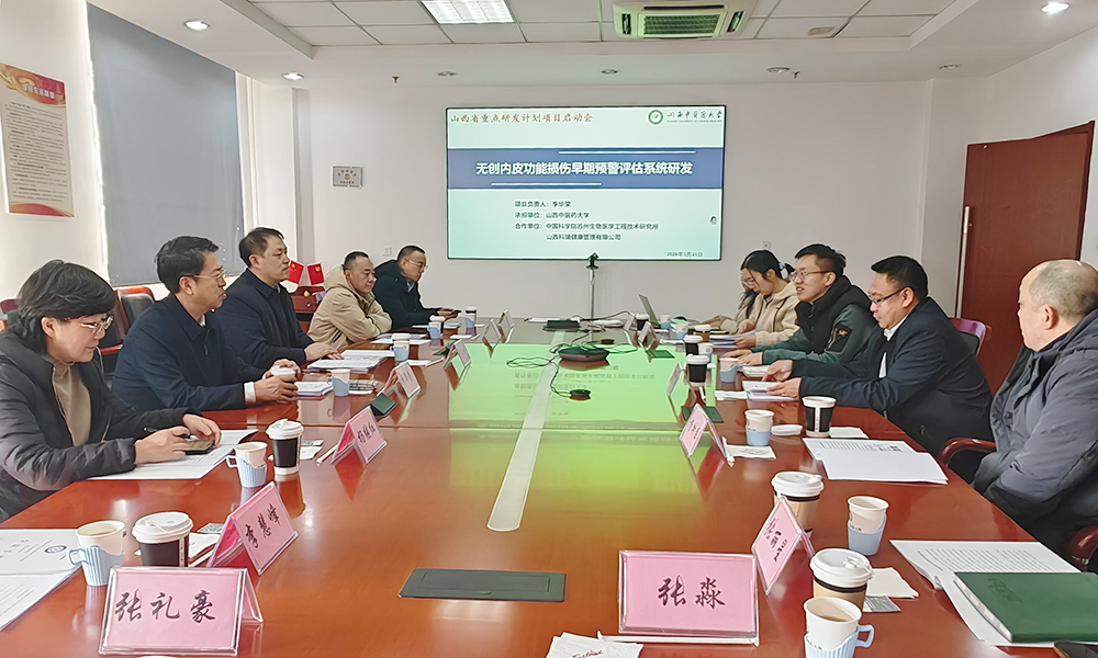 在苏州医工所合作交流期间,我校牵头,苏州医工所和山西科瑞联合承担的山西省重点研发计划项目——“无创内皮功能损伤早期预警评估系统研发”项目启动会同步举行。该项目由山西中医药大学、苏州医工所与山西科瑞健康管理有限公司共同实施,旨在整合我校在气血稳态系统调控和重大慢病相关微血管疾病中医药防治方面的研究基础、苏州医工所在生物医学传感与仪器研发方面的技术优势,以及企业的产业化转化能力,协同攻克重大慢病相关微血管疾病早期无创预警的关键技术难题。项目启动会上,各方就研究目标、技术路线、任务分工及阶段性里程碑进行了充分研讨,标志着这一跨区域、跨学科、产学研深度融合的合作项目进入实质性推进阶段。