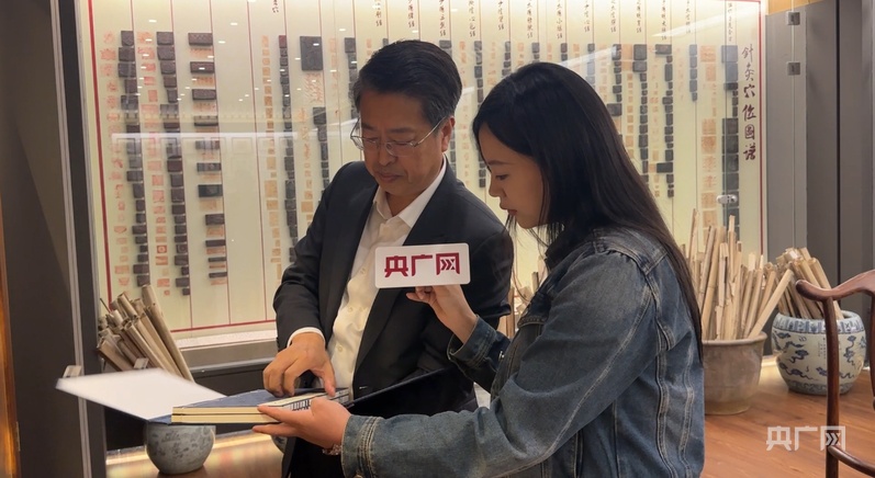 山西中医药大学党委书记李华荣为记者介绍典籍(央广网记者 张晋鹏 摄)