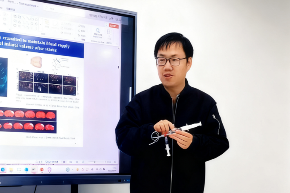 在学术主场,团队全体教师及在校研究生参加活动,达到了聚焦前沿、构筑脑卒中防治的学术基石的目的。团队带头人宋丽娟副教授聚焦学科前沿,以《血管年轻化保卫战》为题,系统地阐述了脑卒中预防的理论框架。她从血管生理功能切入,强调血管作为“生命线”的重要性,引用“一个人的动脉有多老,他就有多老”,阐释了血管健康与机体衰老的内在关联。她指出,脑卒中预防是“始于血管、涉及全身的系统性保卫战”。基于中西医结合视角,她提出了血管年轻化的战略与战术:战略层面强调“天人合一”的整体观,重视情志、气血与作息规律;战术层面涵盖戒烟限酒、精准饮食、科学运动和多维监测等,并结合中医理论和现代医学机制解析了多种食物的保健作用。团队田昊博士聚焦脑的侧支循环解剖结构与调节机制,通过自制的脑血管侧支循环模拟装置,直观地演示了血流代偿的过程。他指出,侧支循环质量直接关系患者预后,团队研究重点在于评估和激活这条“生命备用通道”。创新的演示引起在场教师和研究生们的热烈反响,大家认为这种直观讲述方式深化了对脑血流代偿机制的理解,对后续科研与临床工作具有重要的启发。