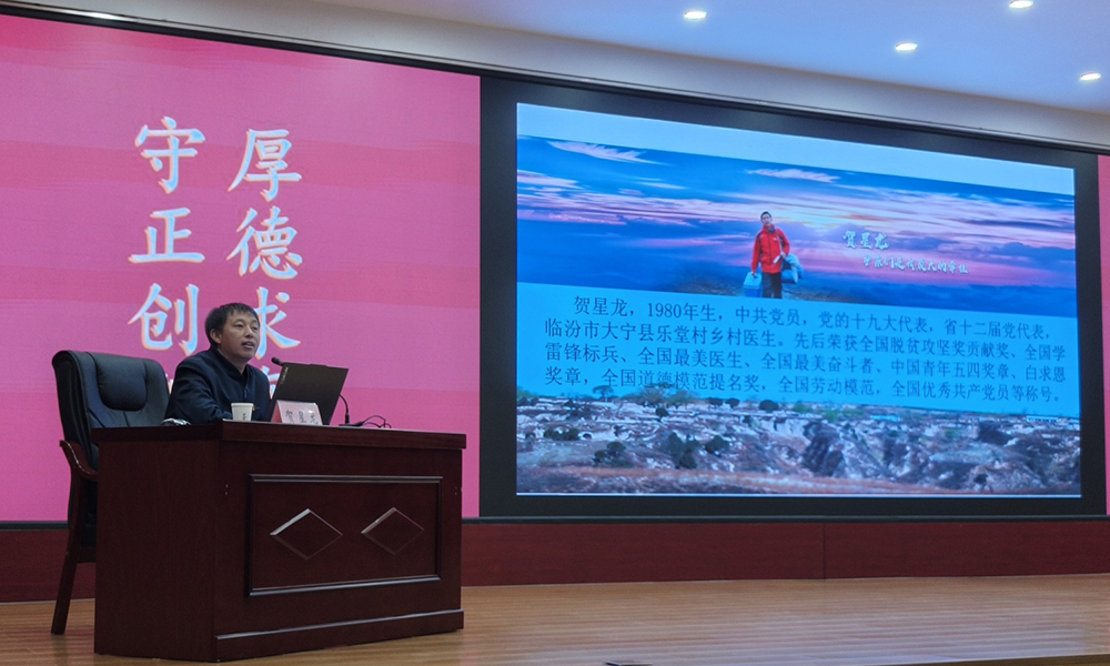 本次报告会特邀党的十九大代表、省十二届党代表、临汾市大宁县乐堂村全国最美乡村医生贺星龙作专题分享。他以摩托为舟、以山路为途、以药箱为责、以人民为亲,奔波在崎岖山道上,连夜出诊救急、免费诊疗帮扶困难群众,日夜守护危重患者,二十余年如一日,用坚守与仁心守护28个村庄4600余名村民的生命健康,以实际行动践行医者仁心与党员初心。