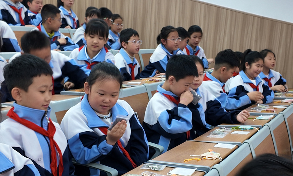 中药香囊手工制作环节,志愿者们准备了常见的中药材,带领同学们通过看外形、闻气味、摸质感的方式,学习每一味药材的功效与日常用途。在志愿者的耐心指导下,同学们将药材装入香囊袋,制作了中药香囊。清浅的草药香萦绕在教室中,孩子们捧着亲手制作的香囊,在动手实践中感受到了中医药的乐趣,也激发了对中华优秀传统文化的浓厚兴趣。