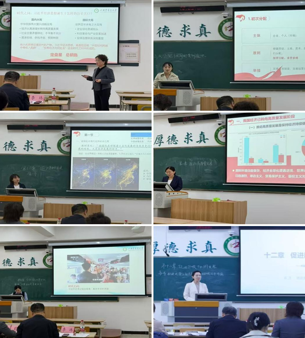 试讲环节中,六位教师分别围绕课程导论、构建三次分配协调配套的制度体系、改革开放是重要法宝、推动高质量发展的三个必然要求、走中国特色新型城镇化道路、构建优势互补高质量发展的区域经济布局等内容进行了系统讲授。教师们紧扣课程要点,结合案例与数据,展示了各自的教学设计与授课思路。